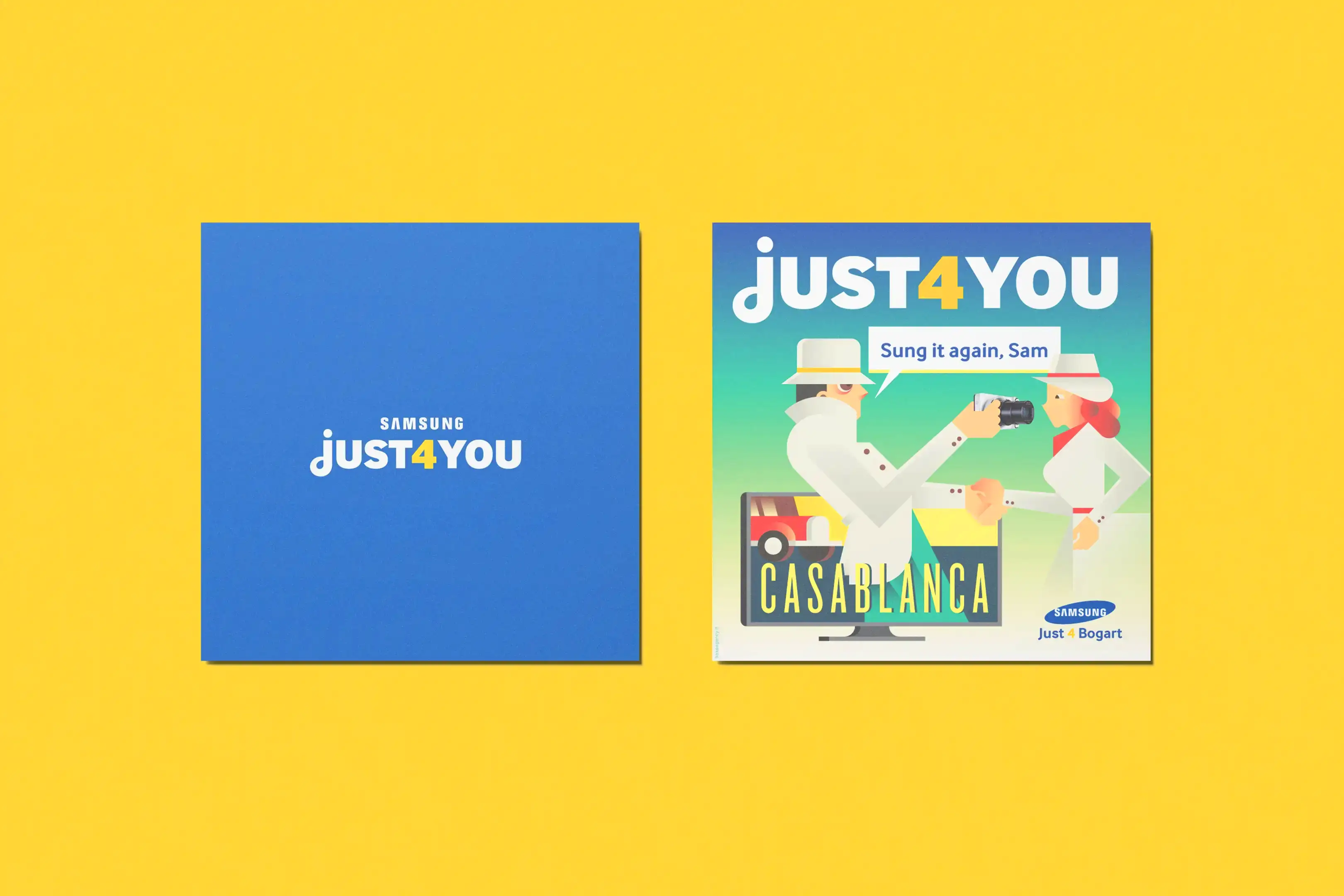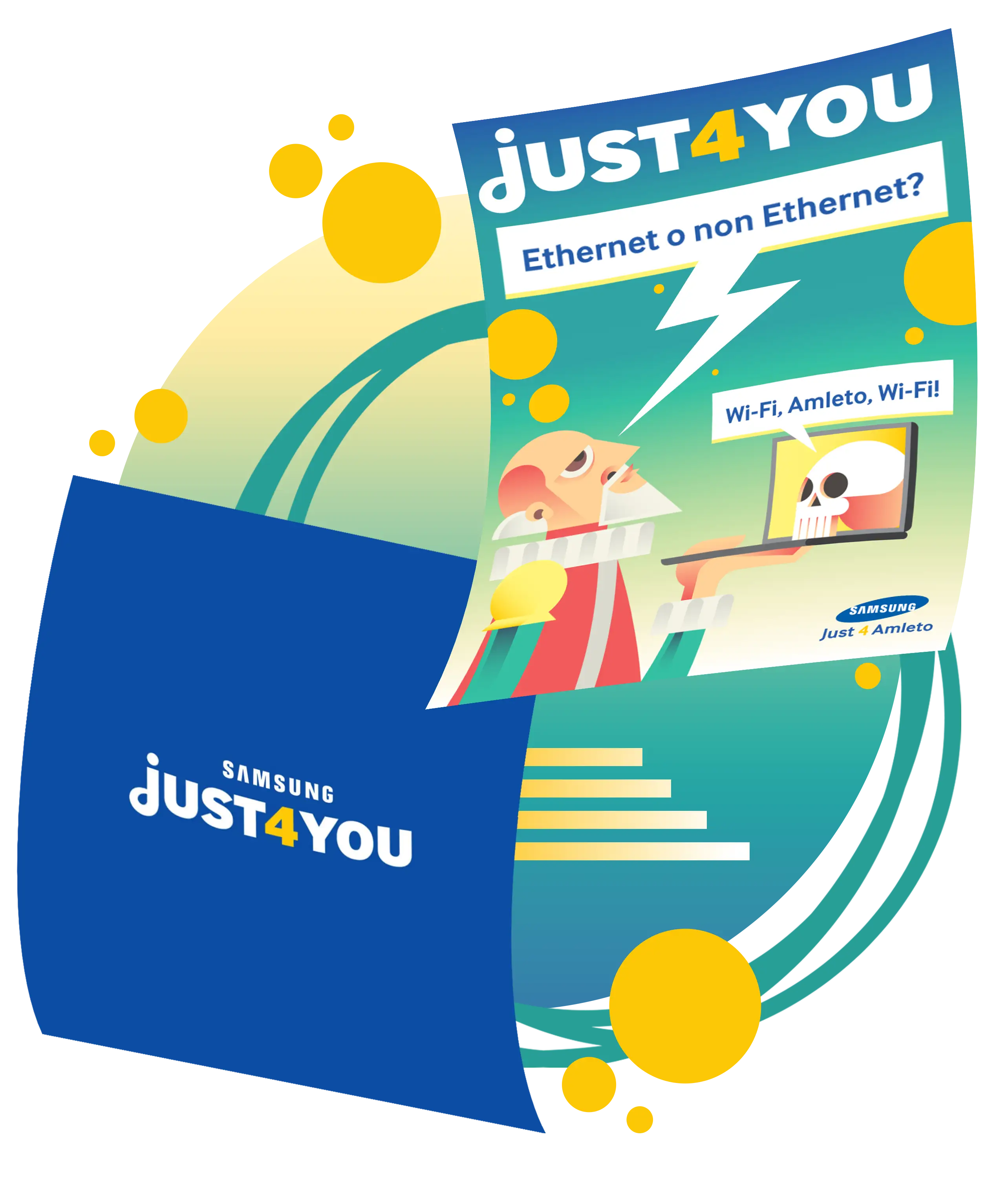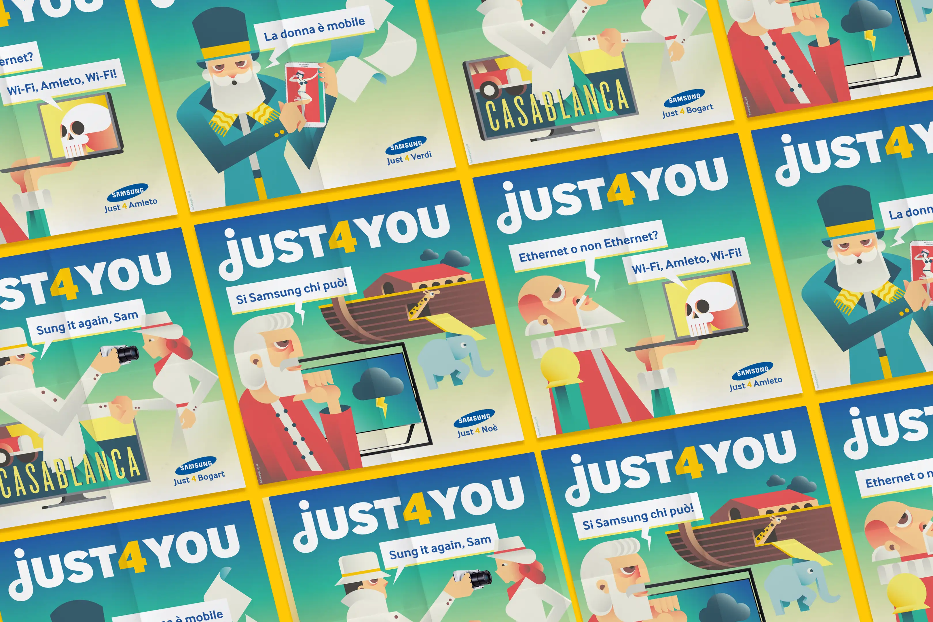 Per Samsung Italia abbiamo sviluppato la campagna di brand positioning “JUST 4 YOU”, pubblicata settimanalmente sulla pagina Facebook del brand. La campagna collega personaggi storici, letterari e artistici come Verdi, Amleto, Noè e Humphrey Bogart ai prodotti Samsung, immaginando in chiave ironica come avrebbero usato la tecnologia moderna. Questo approccio rompe gli schemi tradizionali, creando una connessione diretta tra testimonial e utente finale, e rafforzando il messaggio attraverso illustrazioni grafiche che ricontestualizzano il prodotto mantenendo la sua centralità visiva.