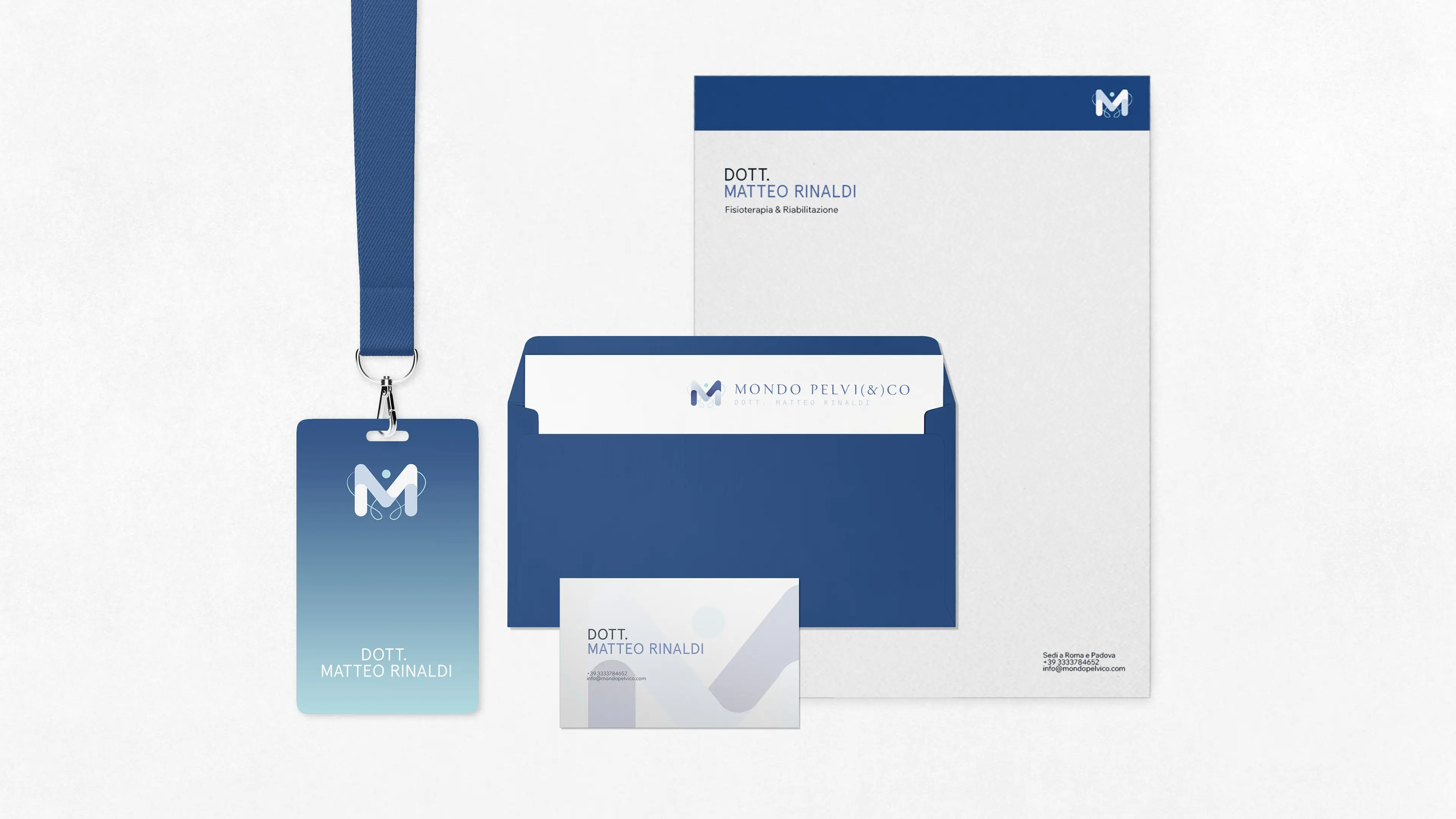 La nuova Brand Identity aiuta Mondo Pelvico, e nello specifico il personal branding di Matteo, a differenziarsi sul mercato creando un’immagine distintiva e riconoscibile. Il nuovo logo con la lettera “M” che si trasforma nella forma del pavimento pelvico, è una scelta altamente strategica. Questo design non solo chiarisce subito l’ambito in cui opera il brand, ma lo rende facilmente riconoscibile e associabile alla figura di Matteo. Nella color palette è la scelta del colore blu a giocare un ruolo fondamentale: sinonimo di fiducia, calma e professionalità, il blu trasmette una sensazione di sicurezza, elemento fondamentale per i potenziali clienti che potrebbero sentirsi vulnerabili riguardo alle possibili problematiche pelviche. Infine, la tipografia scelta per il logo e la comunicazione generale di Mondo Pelvico, restituisce uno stato di modernità e accessibilità. In un settore dove la chiarezza delle informazioni è fondamentale, la leggibilità diventa un aspetto cruciale per garantire che tutti abbiano lo stesso accesso alle informazioni fondamentali.