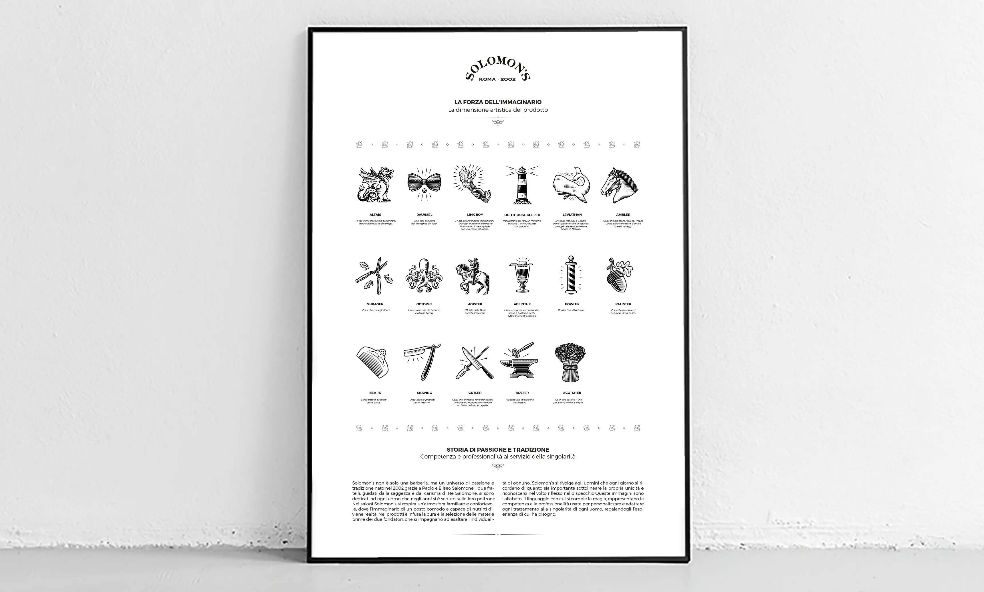 Dalla passione per la barba e i capelli di Paolo ed Eliseo Salomone è nato, nel 2002, il primo salone a Roma con il vecchio marchio Barber Shop Crew. Oggi il brand è racchiuso sotto la saggezza e il carisma del Re Salomone e Solomon’s non è solo una realtà dedicata alla cura della barba; esso incarna uno stile di vita distintivo, dove i valori di saggezza e carisma sono personificati dal Re Salomone.